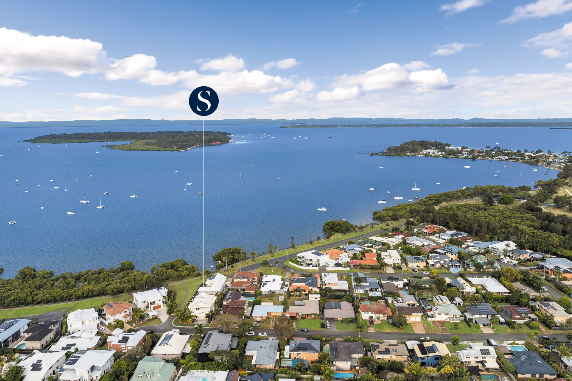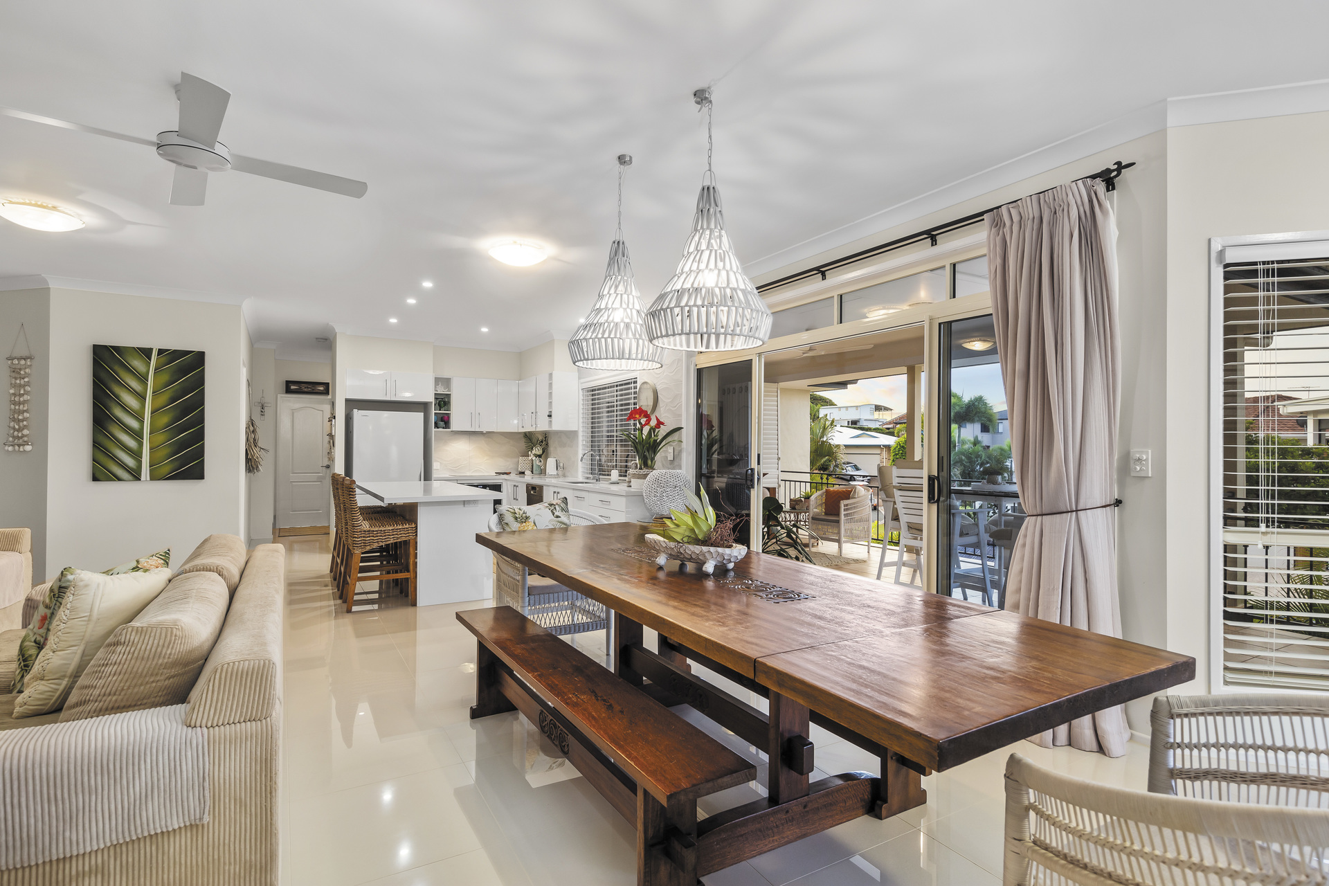 Above, the allure continues on a grand scale. An open plan living and kitchen area, crowned by soaring 2.7m ceilings, exudes an effortless charm. Bathed in natural light, this expansive space flows seamlessly onto a large wrap-around deck, where views of the bay stretch towards Coochie Mudlo and Stradbroke Islands, creating a backdrop of breathtaking beauty.