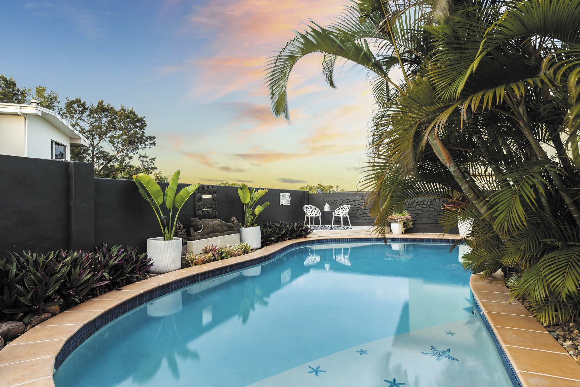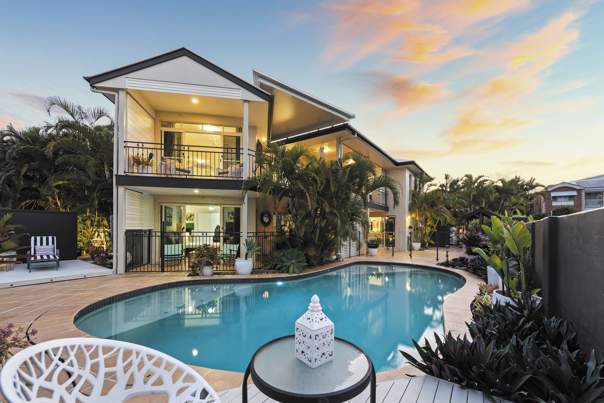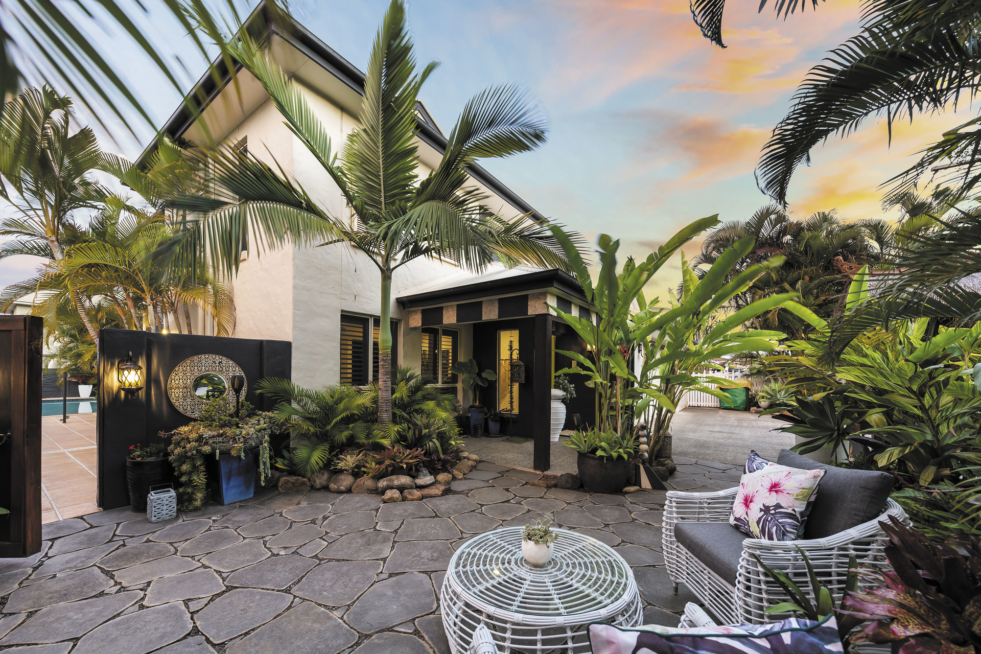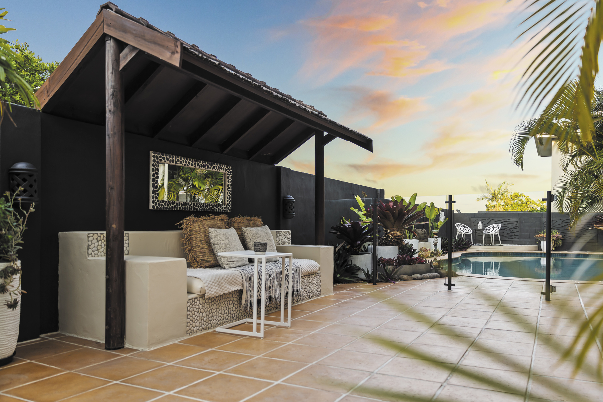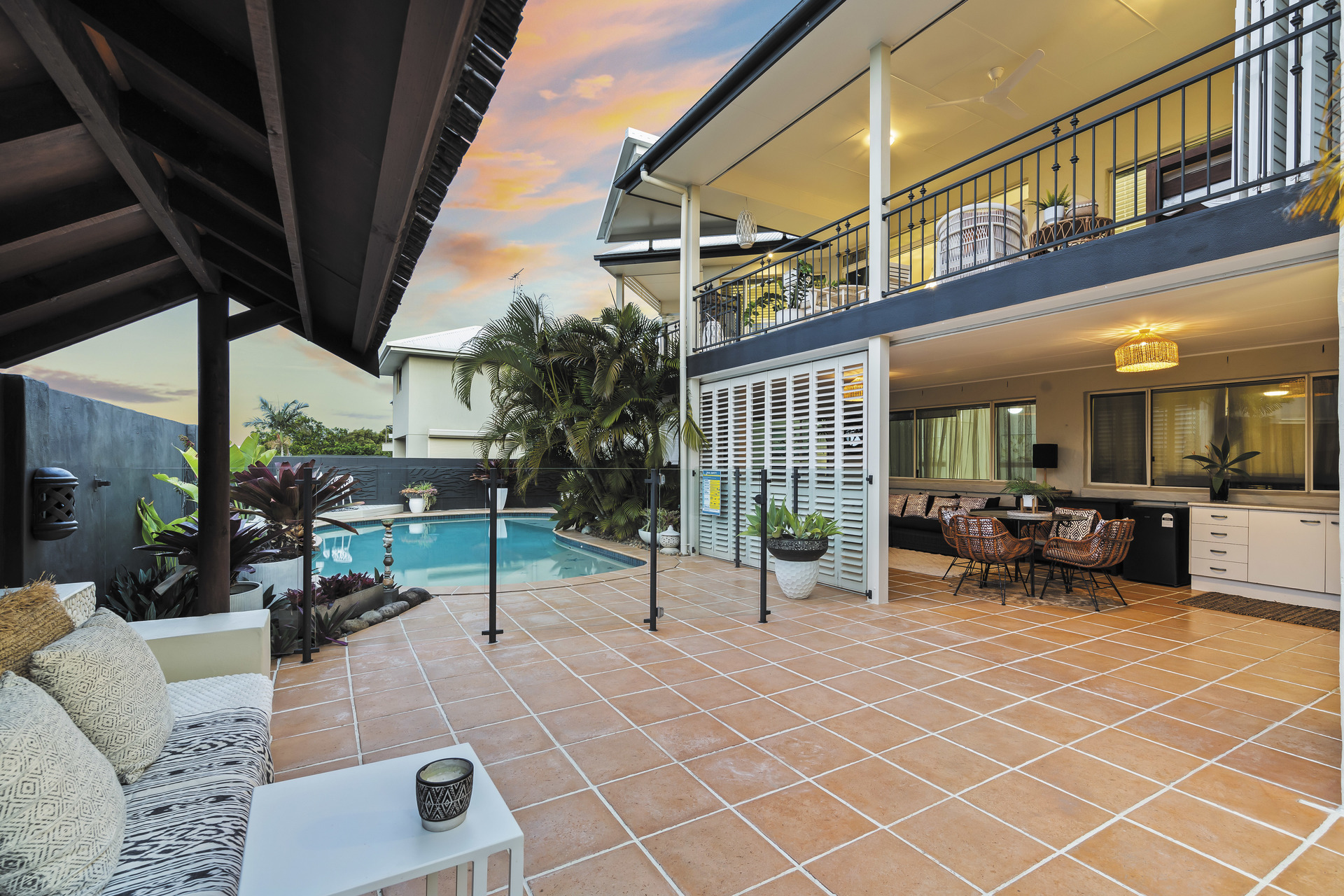 Entertain amidst the lush, Balinese-inspired gardens that grace multiple outdoor living spaces. A sprawling downstairs patio beckons with its own kitchenette, ideal for al fresco dining and gatherings. Overlooking an inviting inground saltwater pool, this space invites you to unwind amidst the verdant tranquillity.