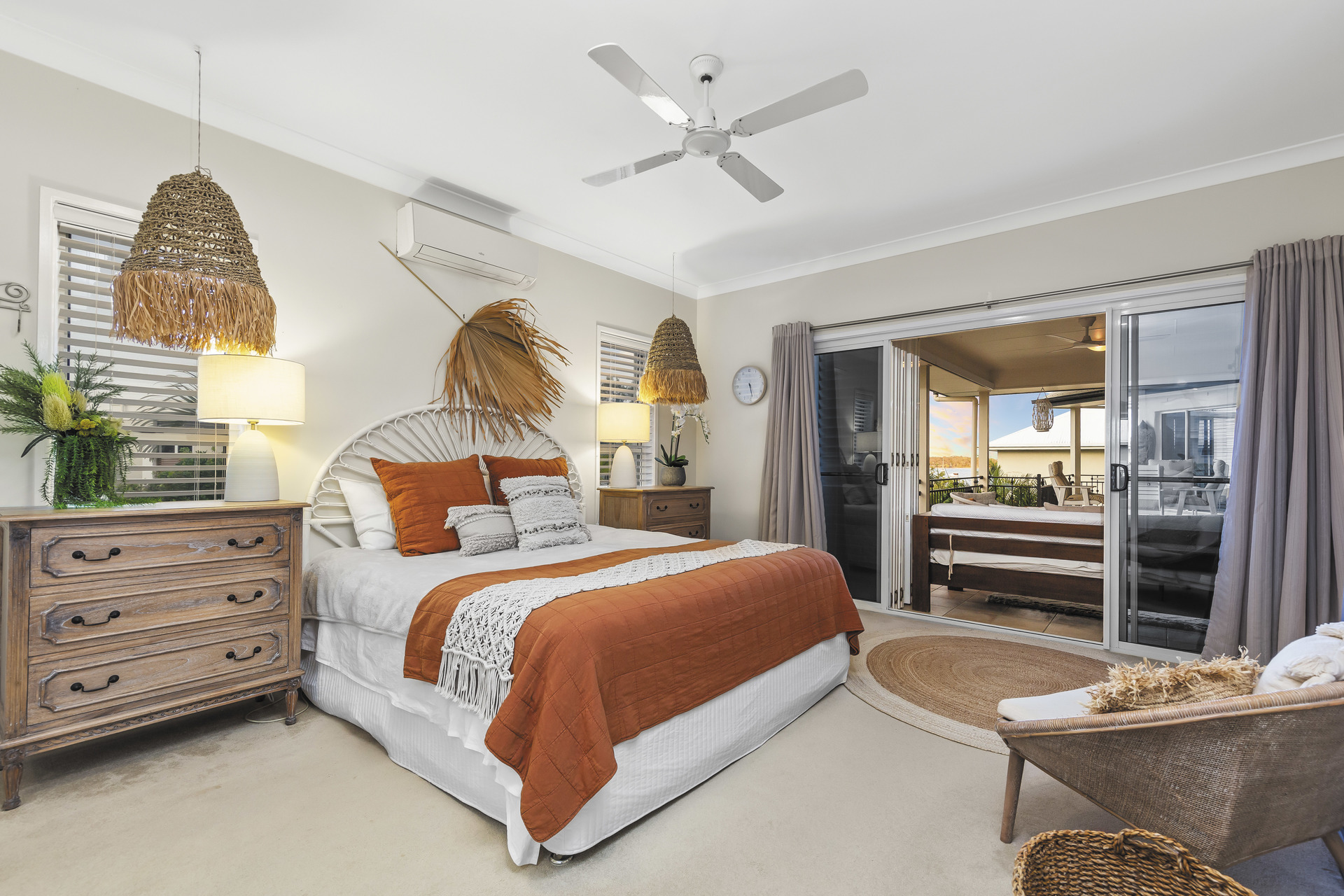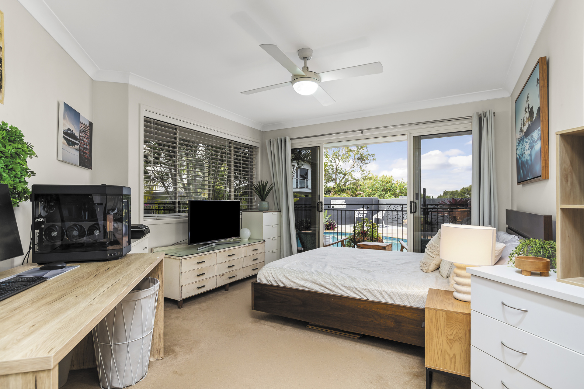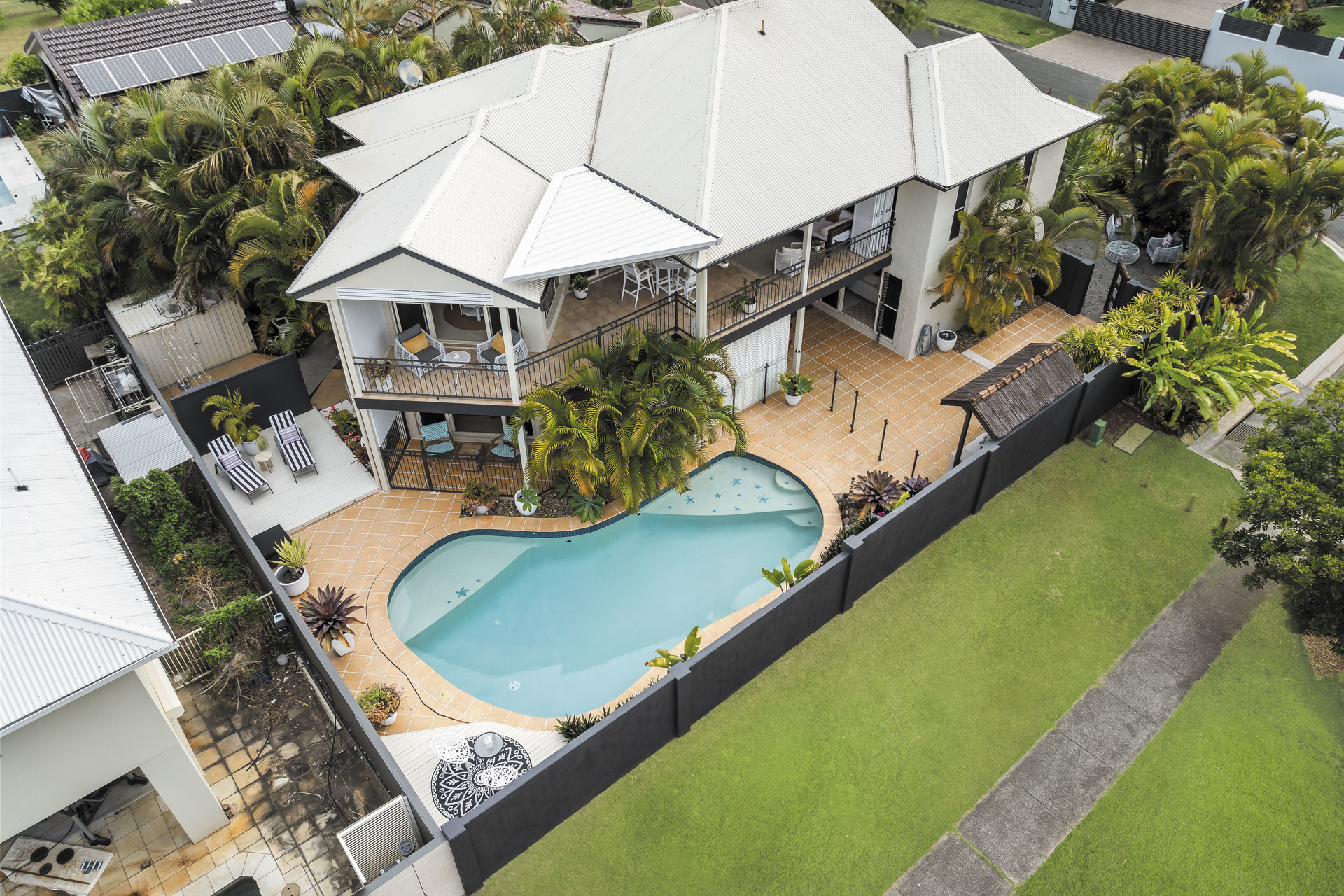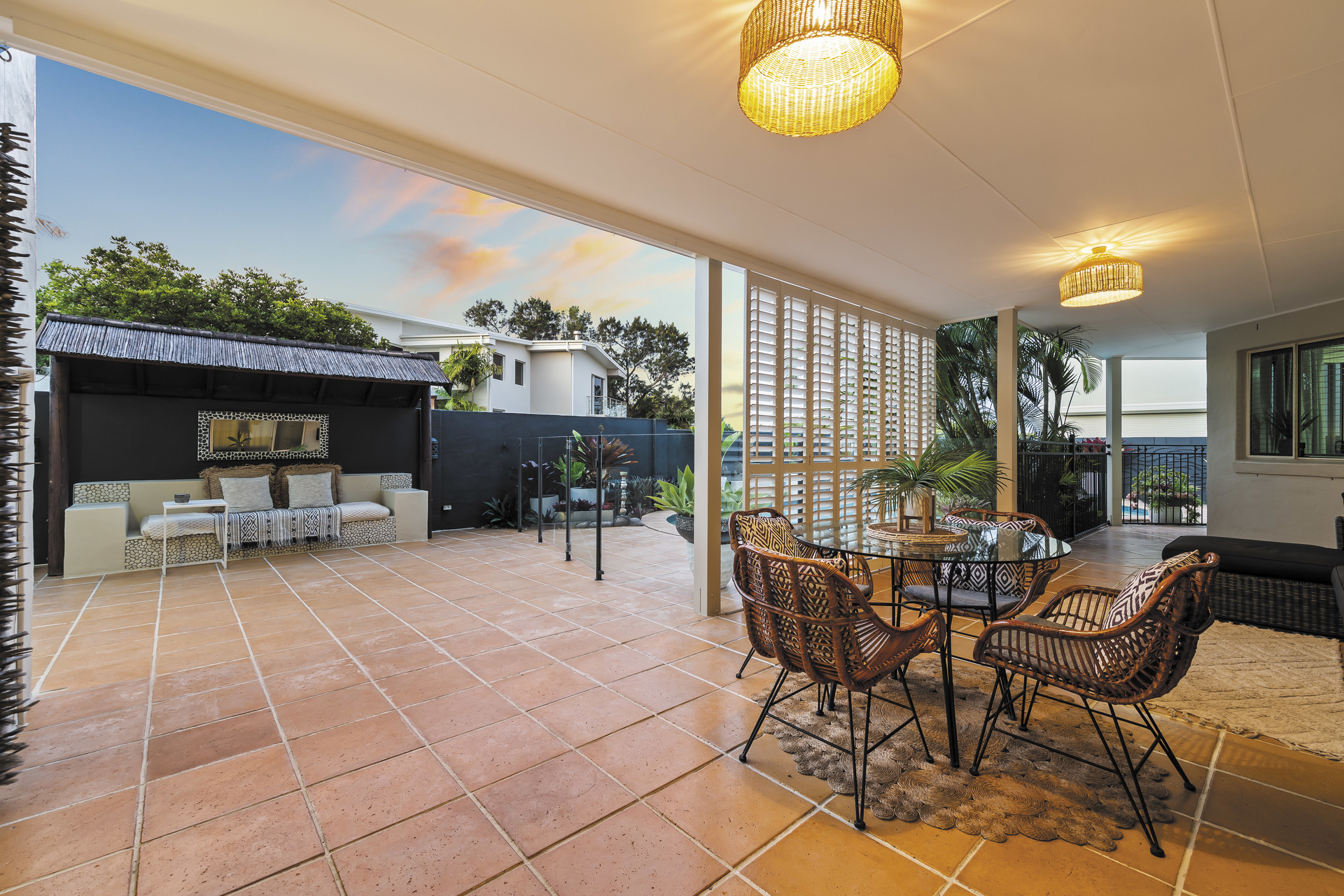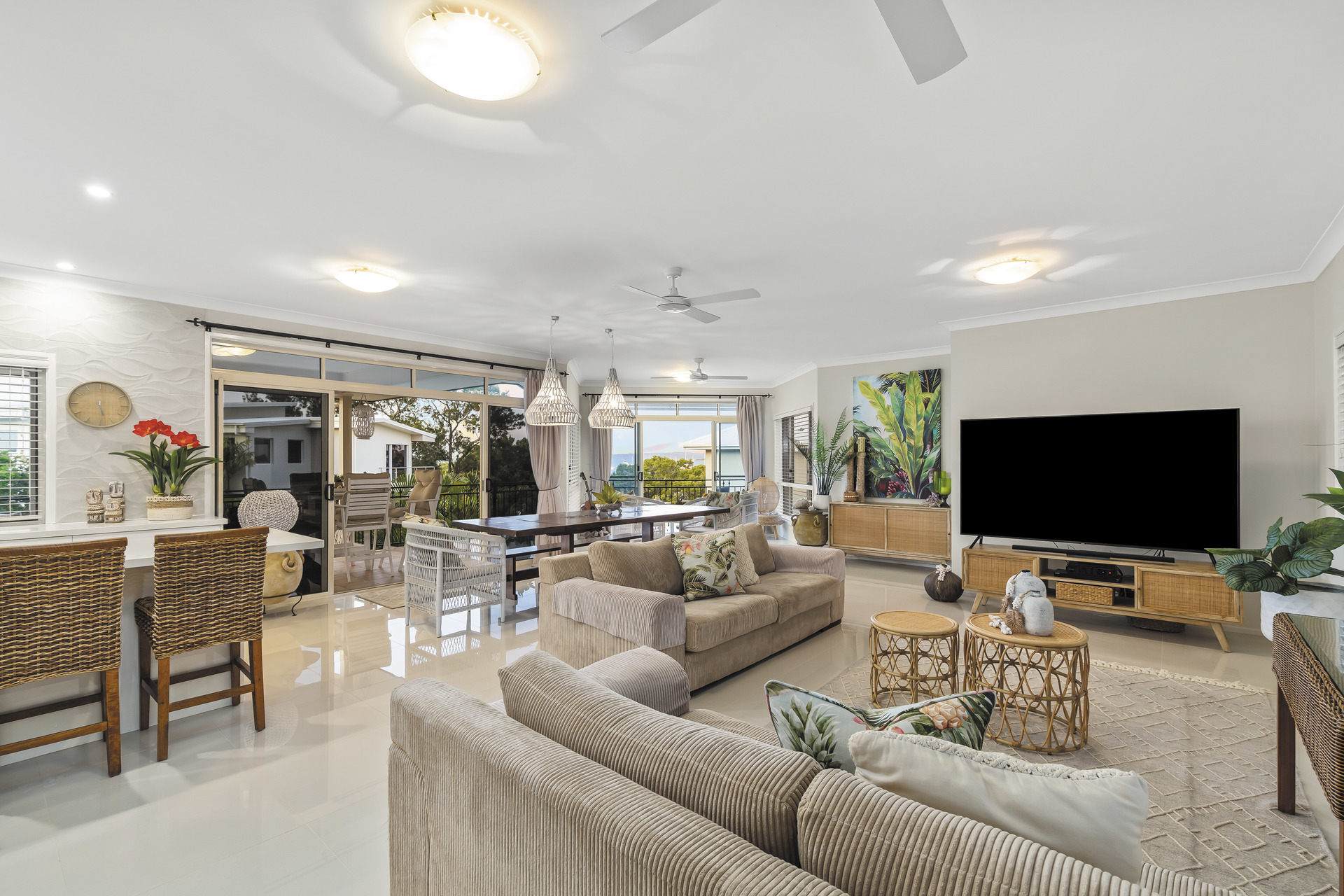 Entertain amidst the lush, Balinese-inspired gardens that grace multiple outdoor living spaces. A sprawling downstairs patio beckons with its own kitchenette, ideal for al fresco dining and gatherings. Overlooking an inviting inground saltwater pool, this space invites you to unwind amidst the verdant tranquillity.
