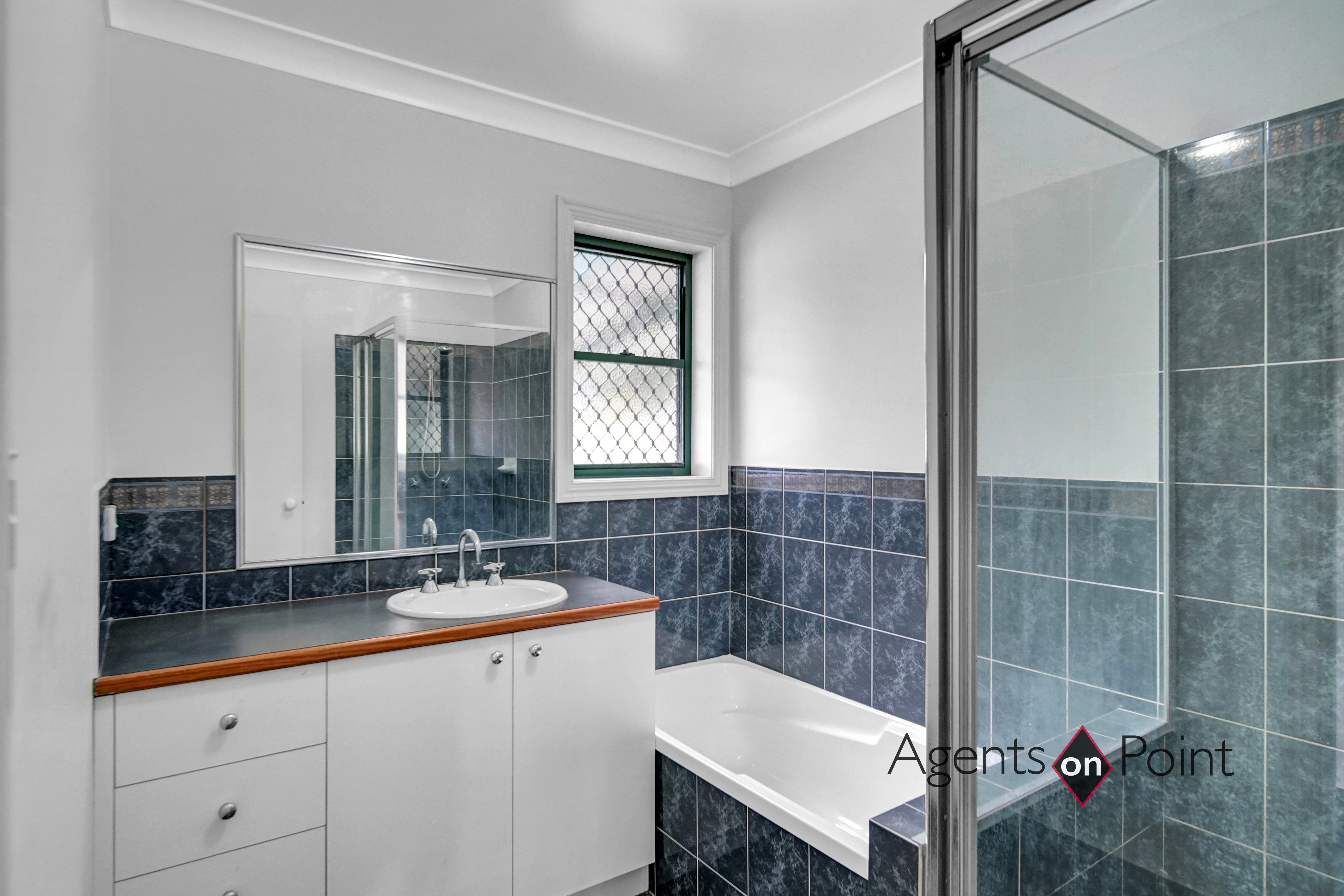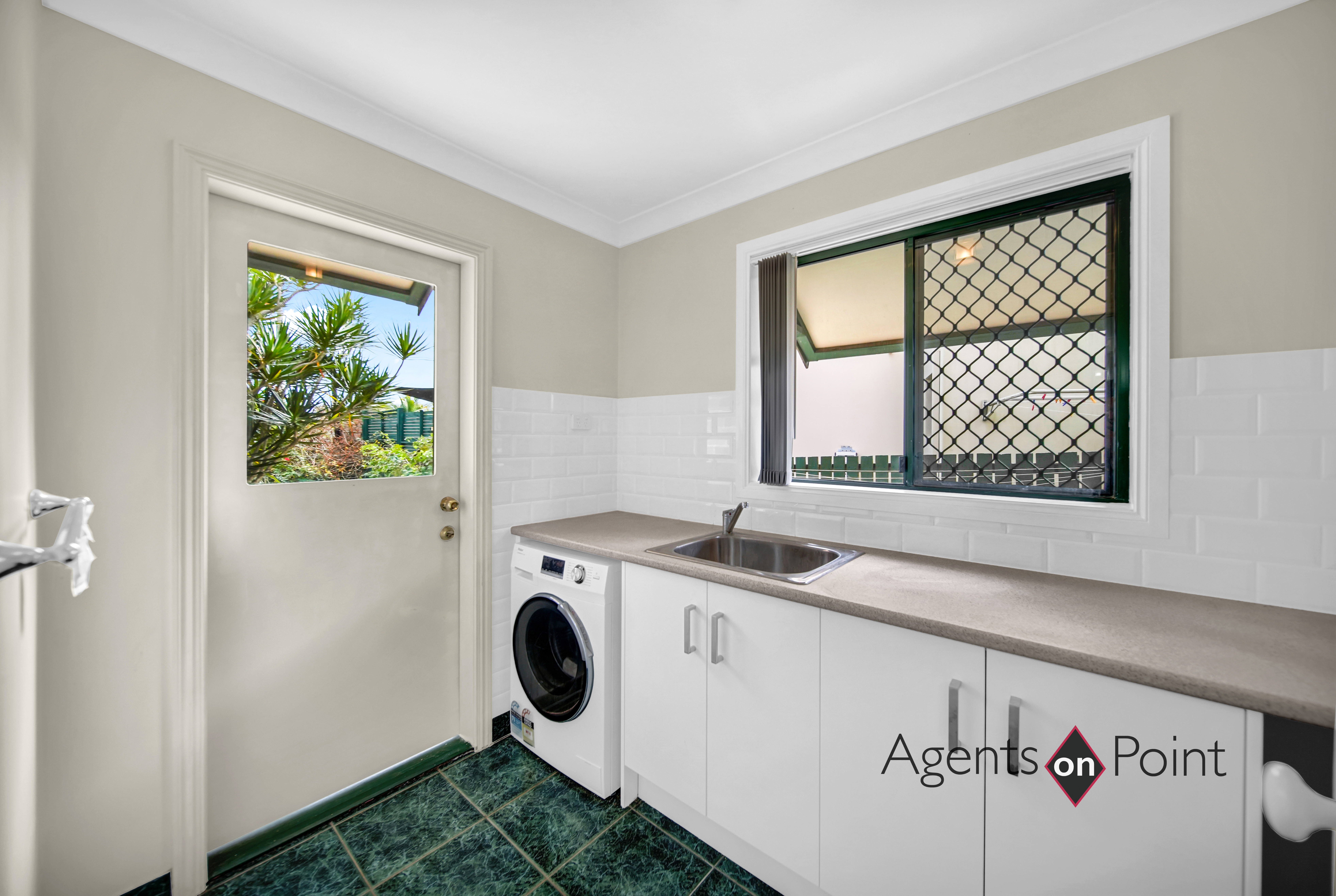Downstairs, you'll find the home offers a tiled rumpus room with three glass sliding doors, making it ideal for a teenager's retreat or potential dual living, with direct access to the pool area. Bedrooms three and four come with built-in robes, fans, and carpet, while the main bathroom includes a bath, shower, vanity, and a separate toilet. The laundry offers ample storage with a tub, benches, and cupboards, and there's additional storage space under the stairs.