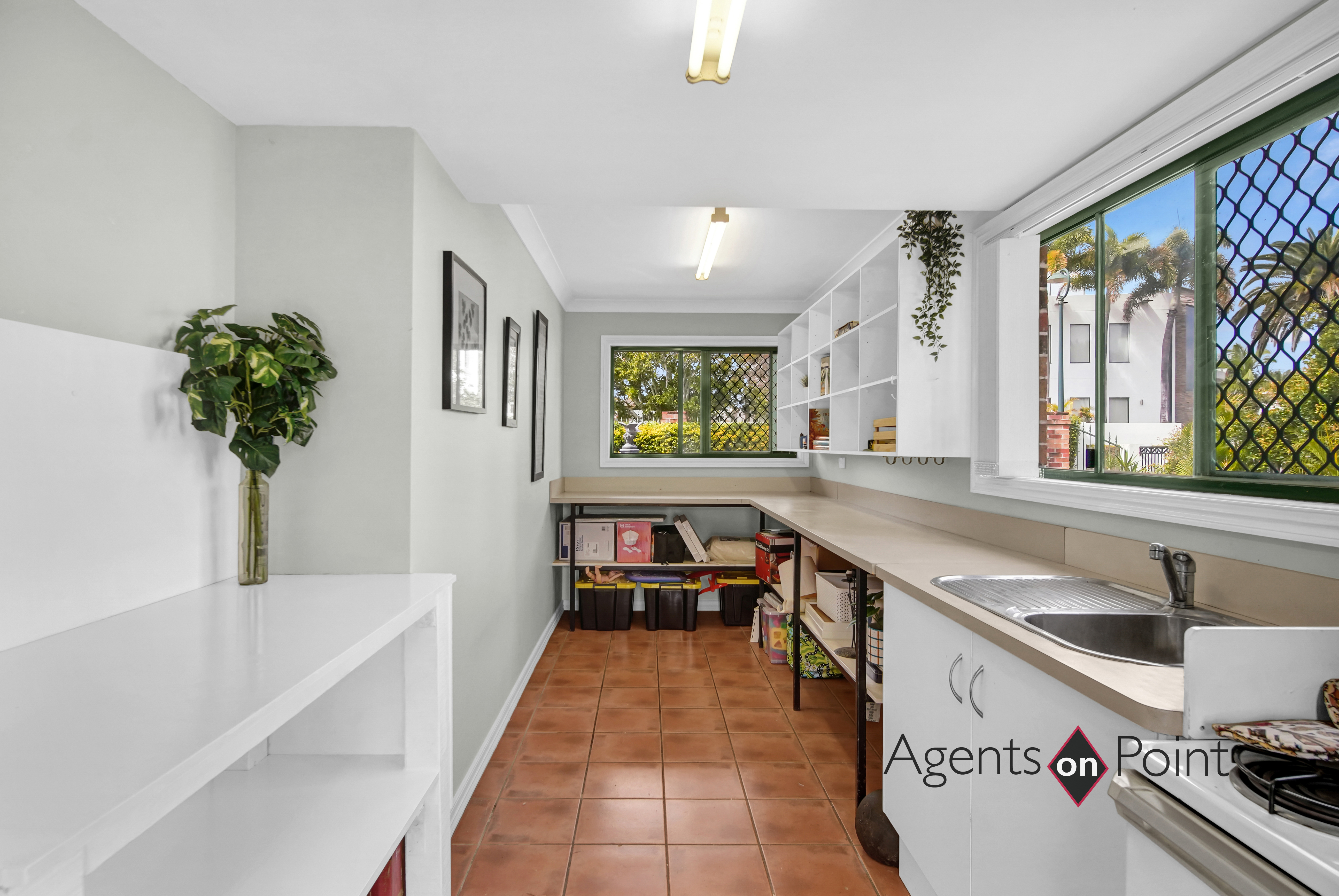 • Bedroom three with bay windows, built-in-robe, air-conditioning, fan and carpet • Bedroom four with built-in-robe, fan, and carpet • Main bathroom with bath, shower, vanity, and a separate toilet • Laundry with tub, benches and cupboards • Understairs storage • Large Studio Room suitable for hobby room or home office/business. Fitted with sink, oven, benches and shelves