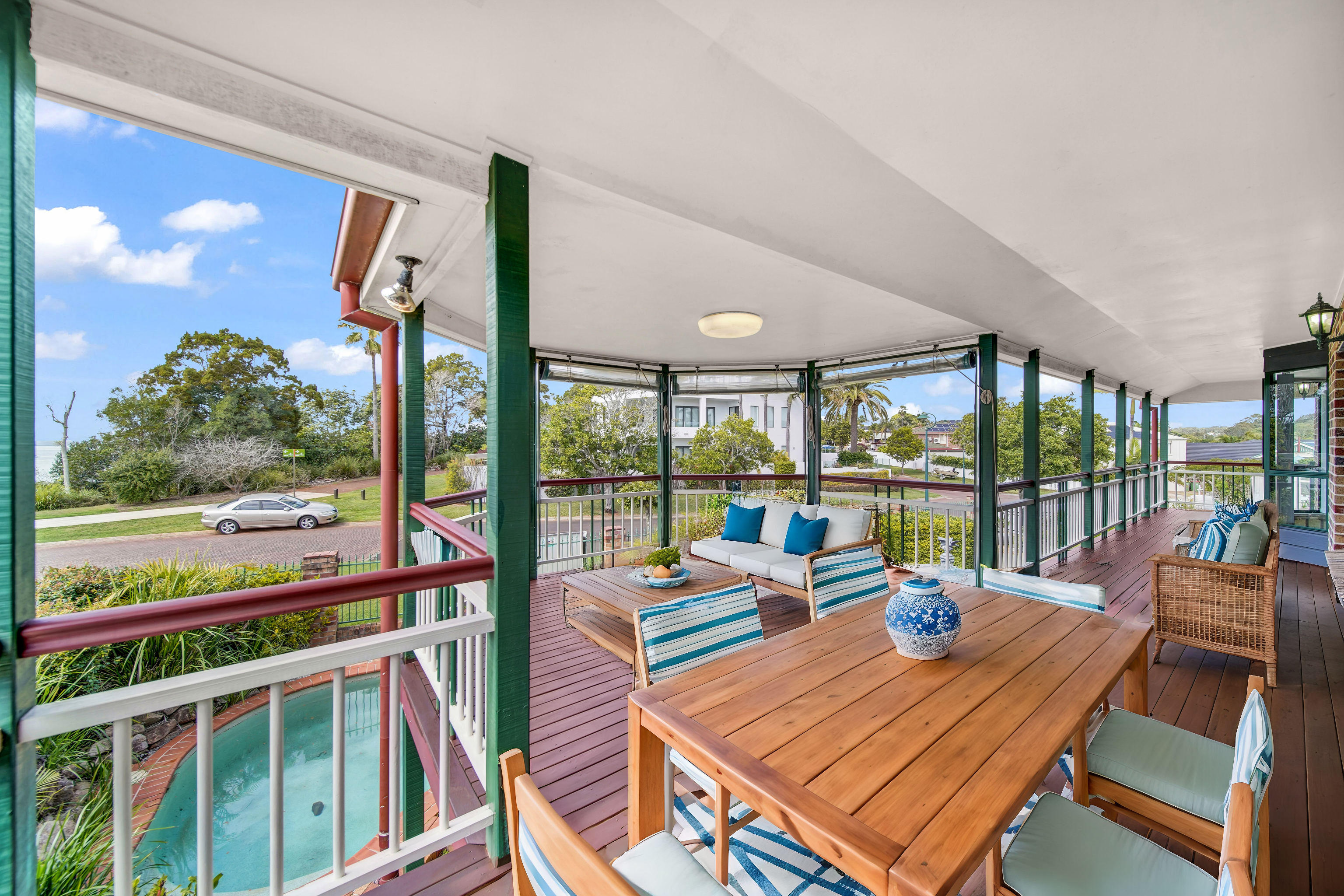 Outdoors • Sprawling 700m2 block and 23m frontage • The sparking salt/chlorine pool with spa is concrete kidney-shaped holds 33,000 litres and comes with pool equipment. • 4m-wide side access for van/boat, stencilled concrete driveway with electric gates accommodates 5 x cars • Detached double garage with electric roller doors. • Carport on slab behind garage can accommodate small boat, jet ski or trailer • Stencilled concrete patio • Beautiful water feature with doves & roses • Large outdoor entertainment area out the back with stencilled concrete