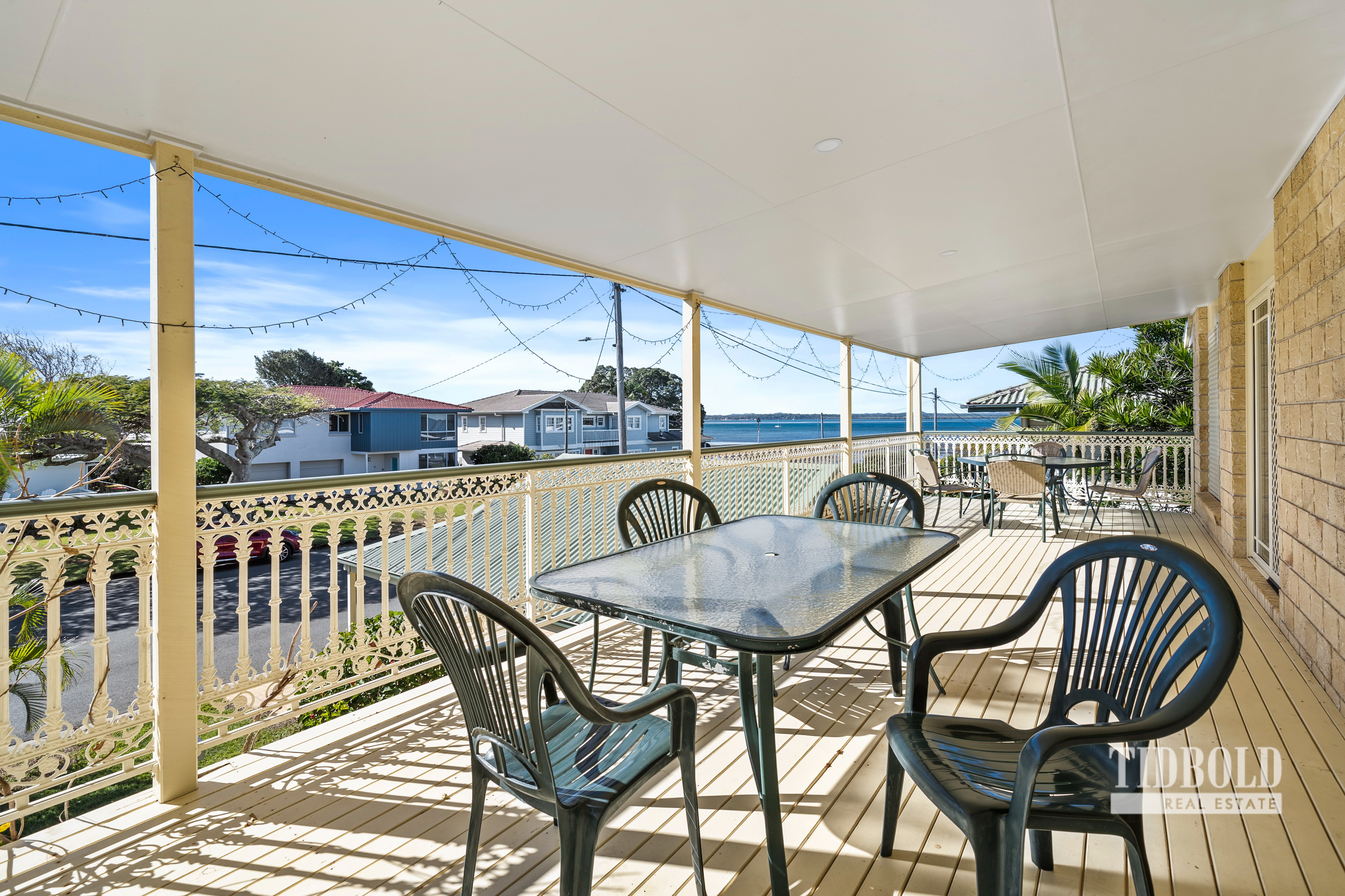 > Timber kitchen with stone benchtops, dishwasher, cupboard pantry, electric stove and oven and servery window to deck. > Extra wide timber deck facing North-East, with stunning views of beautiful Moreton Bay,